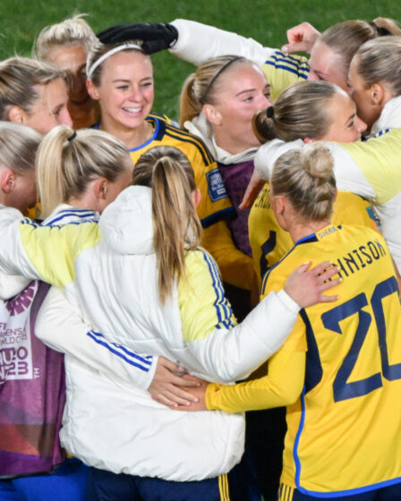 Les joueuses suédoises célèbrent leur premier but lors du match de quart de finale de la Coupe du monde féminine Australie et Nouvelle-Zélande 2023 entre le Japon et la Suède à l’Eden Park d’Auckland le 11 août 2023. (Photo par Michael Bradley / AFP) Elle n’attire pas autant l’attention que nombre de ses rivales, mais …