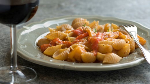 Assiette des années 1990 : Pâtes aux grains entiers avec du blanc de poulet ou du saumon, et sauce à la crème fraîche aromatisée avec des légumes.