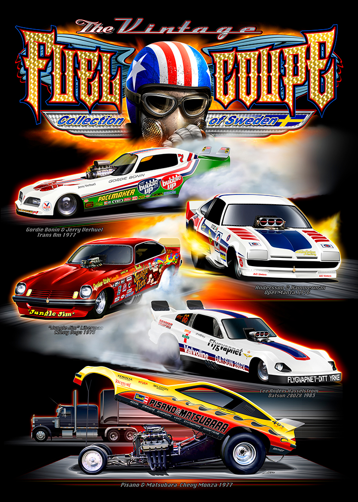 Mon ami Janne Johansson, qui possède la Vega 1975 originale de « Jungle Jim », la Trans Am 1977 de Gordie Bonin et la Monza 1977 de Pisano, m’a beaucoup aidé en me donnant des informations. L’affiche ci-dessus a été réalisée dans le cadre de sa « Collection de coupes à essence anciennes de Suède ».