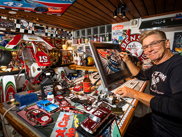 « À 15 ans, j’ai laissé tomber les bombes aérosols et j’ai acheté mon premier aérographe. En 1979, le héros des courses de dragsters de notre ville m’a laissé peindre sa voiture de course Volvo PV, et depuis lors, je me consacre à la fois à l’illustration et à la peinture de voitures de course. »