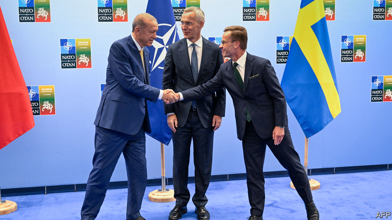 OTAN avertissent que l’adhésion de la Suède n’est pas une affaire réglée. Un accord similaire conclu à la veille du sommet de Madrid l’année dernière s’est avéré moins décisif qu’il n’y paraissait à l’époque. Mais Jens Stoltenberg, OTANa tweeté que Recep Tayyip Erdogan, le président de la Turquie, avait accepté de transmettre la candidature de la Suède au parlement turc.ASAP« et de « garantir la ratification ». La nouvelle est tombée peu après une réunion entre M. Stoltenberg, M. Erdogan et Ulf Kristersson, premier ministre suédois, qui a elle-même couronné des semaines de diplomatie intensive entre les trois parties.