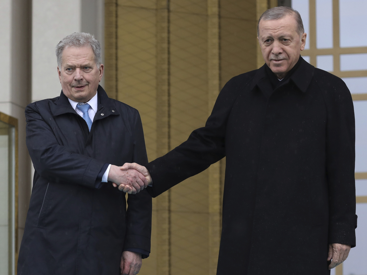 Le président turc Recep Tayyip Erdogan, à droite, et le président finlandais Sauli Niinisto se serrent la main lors d’une cérémonie de bienvenue au palais présidentiel d’Ankara, en Turquie, vendredi.