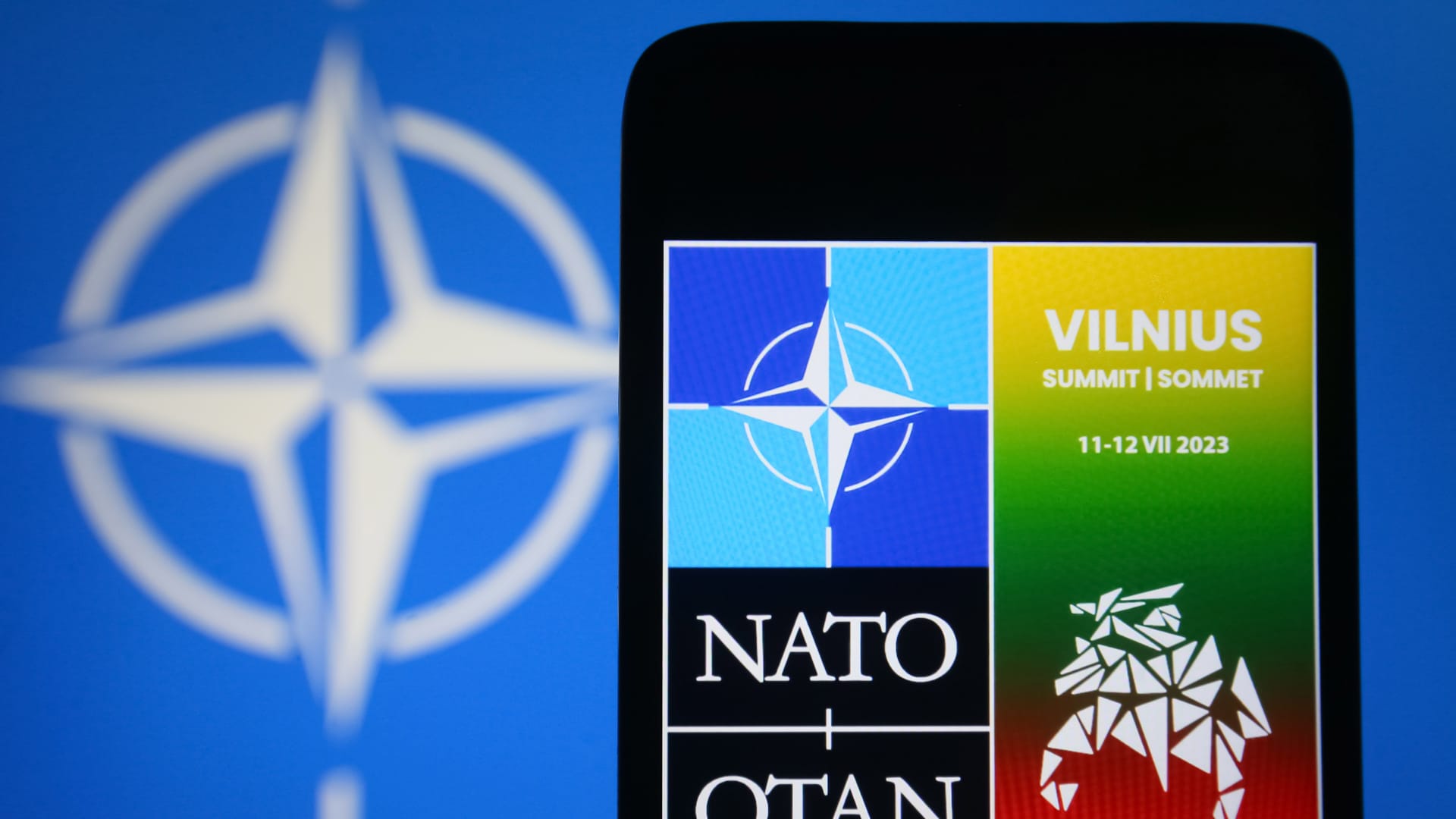 Logo du sommet de l’OTAN Vilnius 2023 sur l’écran d’un smartphone.