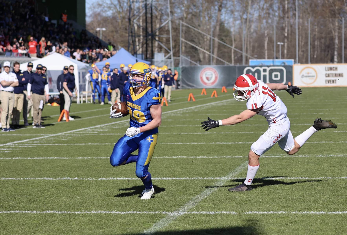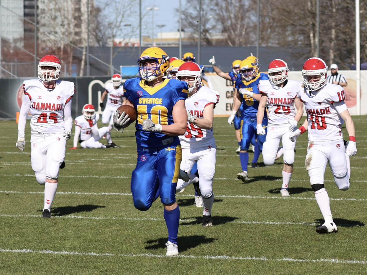 Vilgot Valeskog, attaquant de l’équipe de Suède (n°29), a été le joueur du match lors de la victoire sur le Danemark après avoir parcouru 264 yards Photo Stefan Akander