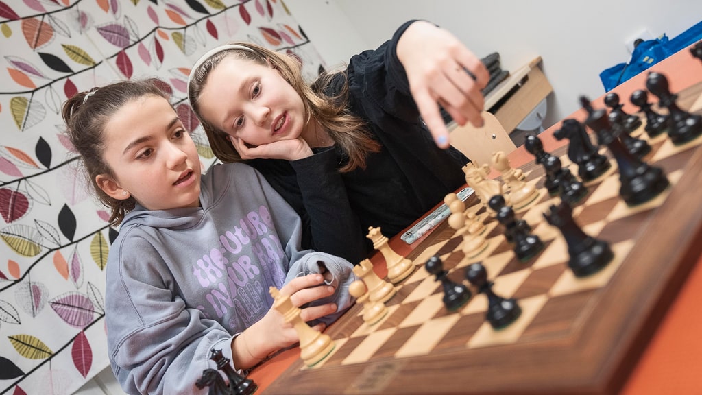 À première vue, la salle de classe ressemble à n’importe quelle autre salle de classe de collège. Sur les chaises, il y a des sacs à dos de toutes les couleurs, sur les murs, il y a des notes sur les valeurs de l’école et à l’avant, il y a un professeur qui enseigne devant le tableau noir. Mais si vous regardez de plus près, cette salle de classe se démarque. Les tiroirs sont marqués de « pièces d’échecs supplémentaires » et de « cloches d’échecs », l’emploi du temps indique « théorie des échecs » et le professeur enseigne des termes tels que « fourchette » et « tireur ».