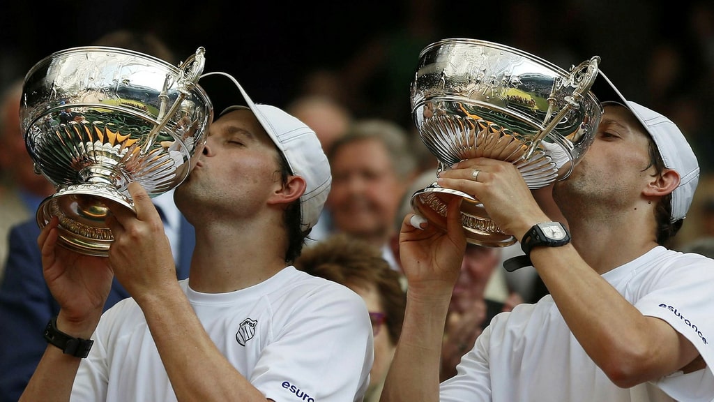 Les frères Mike et Bob Bryan embrassent les bosses après leur victoire à Wimbledon 2013.