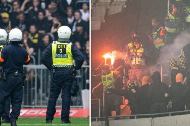 Les clubs préfèrent s’occuper eux-mêmes de la sécurité et sont reconnaissants aux autorités de leur implication. Résultat : feux d’artifice, affrontements violents entre supporters masqués et policiers, tribunes en feu, plusieurs blessés. L’attaquant de l’AIK, John Guidetti, a été touché à la tête par un objet et a dû être évacué.