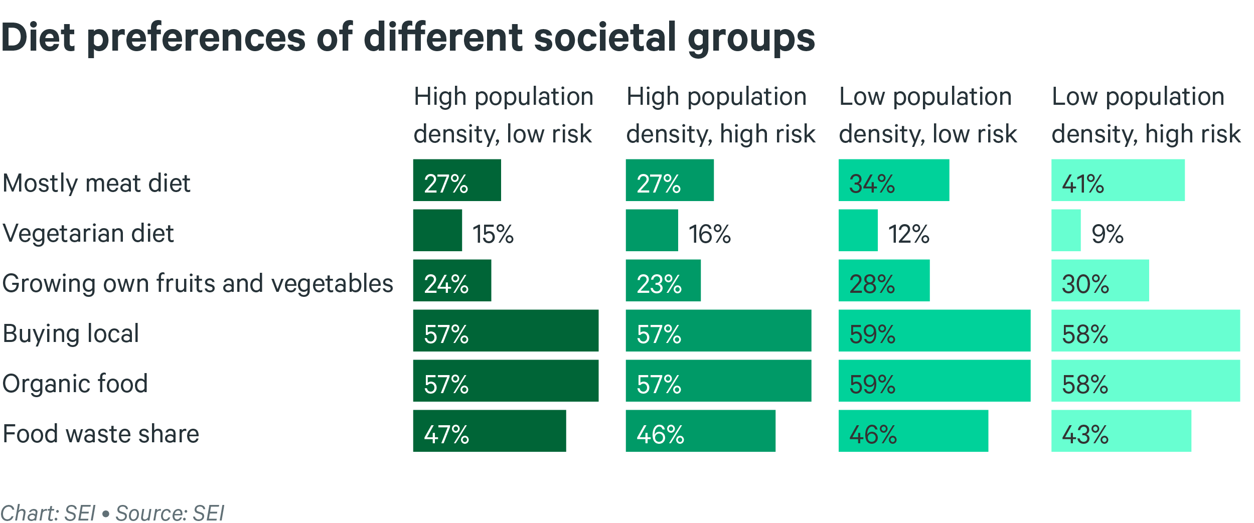 La consommation de viande en Suède a connu une hausse substantielle de 66 % en 2018 par rapport à 1960. En moyenne, les gens ont consommé 32 kg de viande par personne et par an, ce qui a contribué à 40 % de la consommation totale de viande, et 24 kg de bœuf, ce qui représente 30 %. Notre recherche explore les habitudes de consommation alimentaire des groupes que nous avons définis et constate qu’un pourcentage plus élevé de résidents ruraux présentant un risque élevé d’exclusion sociale suivent un régime alimentaire essentiellement à base de viande et représentent le plus faible pourcentage de personnes pratiquant un régime végétarien. En revanche, ce groupe obtient de meilleurs résultats que ses homologues urbains en ce qui concerne l’adoption de pratiques durables telles que la culture de leurs propres produits, l’achat d’aliments locaux et biologiques et la réduction des déchets alimentaires.