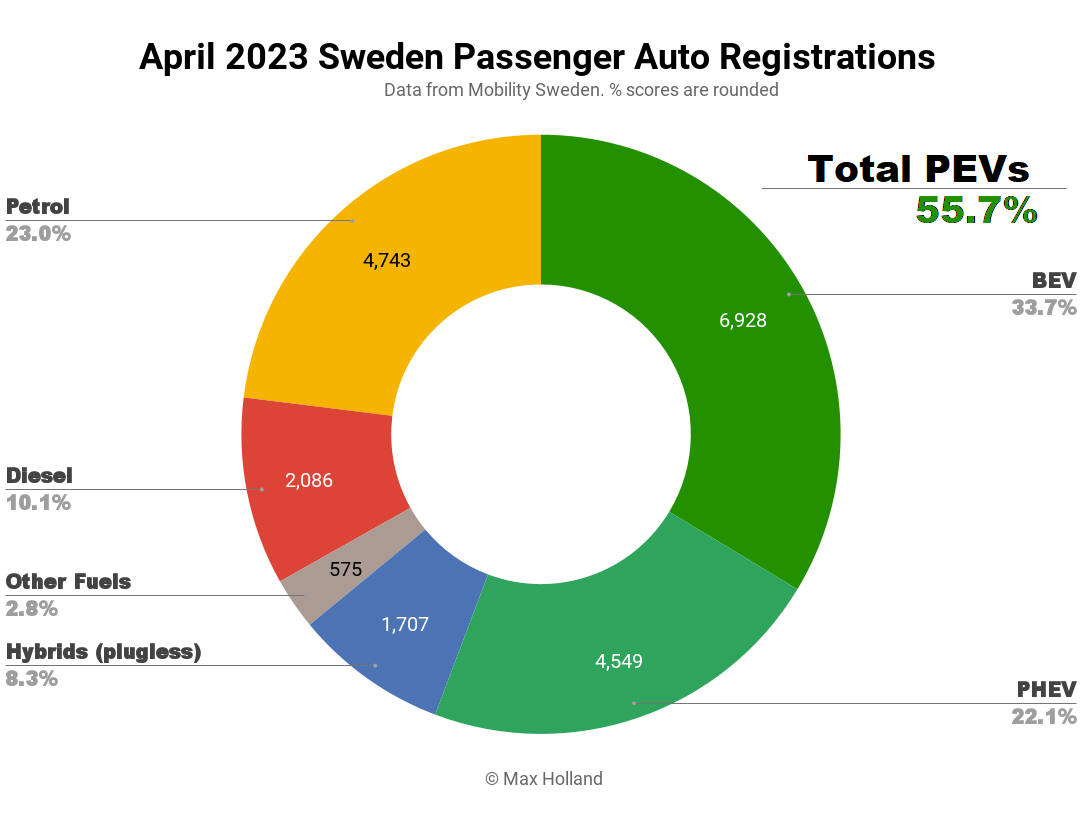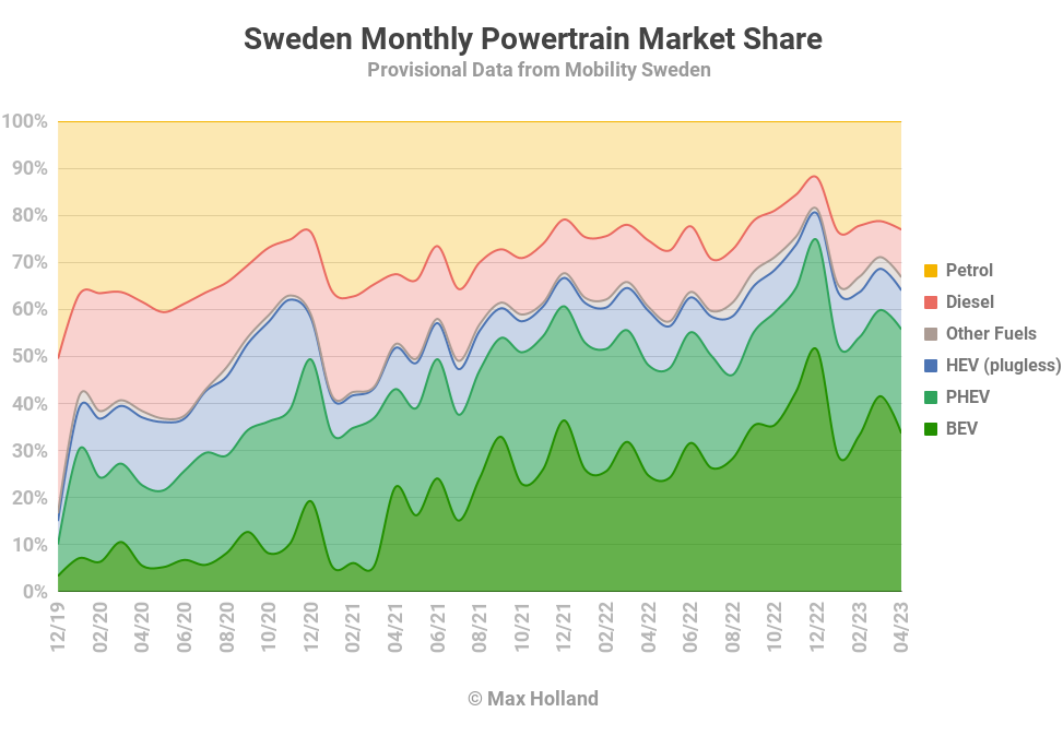 Alors que d’autres régions, moins avancées dans la transition vers les VE, voient une augmentation des HEV (hybrides sans bougie – une technologie de transition temporaire), en Suède (et en Norvège), cette catégorie est déjà en train de devenir une catégorie à part entière. dépassée. La part des véhicules électriques hybrides en Suède a chuté de 11,5 % à 8,3 % en glissement annuel.