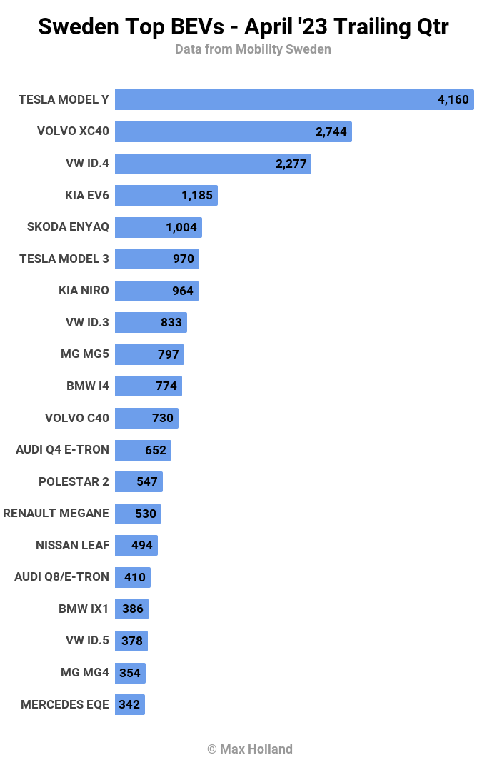Plus bas dans le classement, la Toyota BZ4X – après 8 mois d’interruption pour résoudre des problèmes initiaux – a récemment augmenté son volume en Suède, et a atteint un nouveau record de 190 unités en avril (12e place). La variante Lexus du BZ4X, appelée Lexus RZ, a également fait ses débuts en Suède en avril, avec une modeste immatriculation de 12 unités. Elle partage le même format et les mêmes bases que la BZ4X, mais dispose d’un moteur plus puissant, est légèrement plus grande et plus lourde (4805 mm de long, et 2296 kg), avec une autonomie réelle légèrement inférieure, et un prix plus élevé (à partir de 67 000 €).