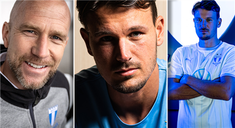 Rydström félicite les joueurs offensifs de la MFF, Taha Ali, Kiese Thelin et Sebastian Nanasi, pour leur début de saison.
